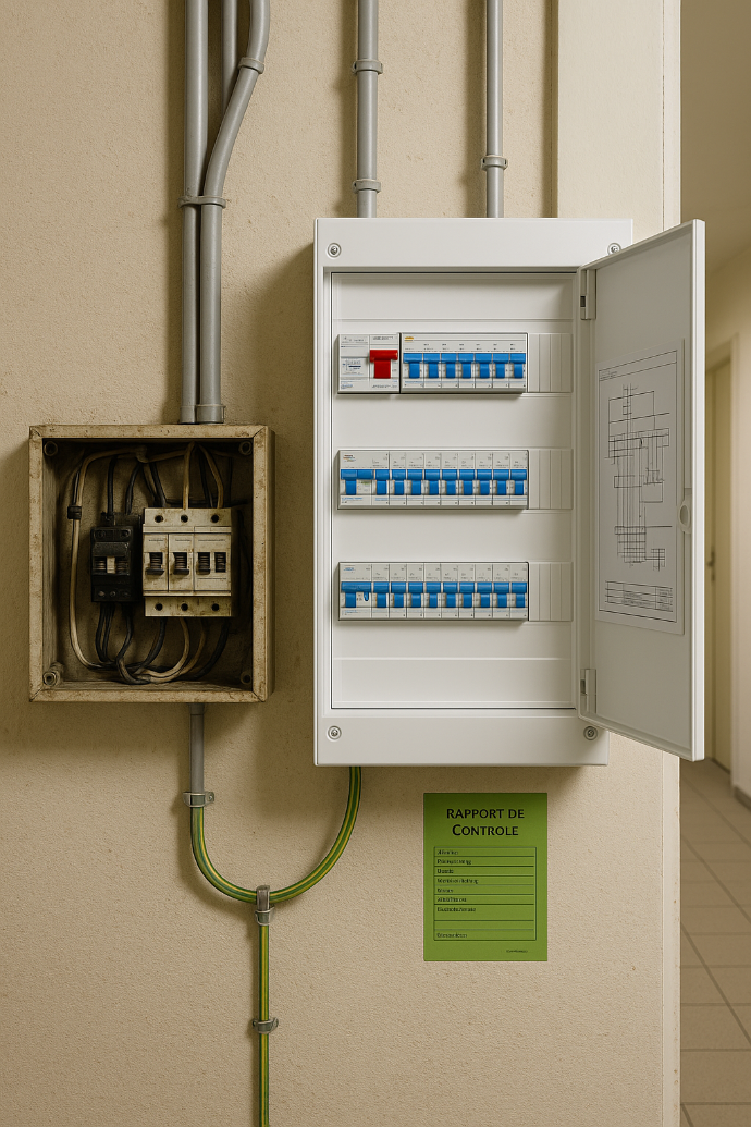 Nous identifions les écarts aux normes, proposons des solutions adaptées à chaque immeuble et réalisons les travaux requis : mise à la terre, remplacement de coffrets, protection différentielle, etc. Objectif : sécurité, conformité RGIE, et tranquillité pour les copropriétaires.